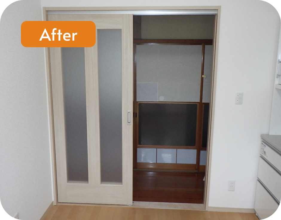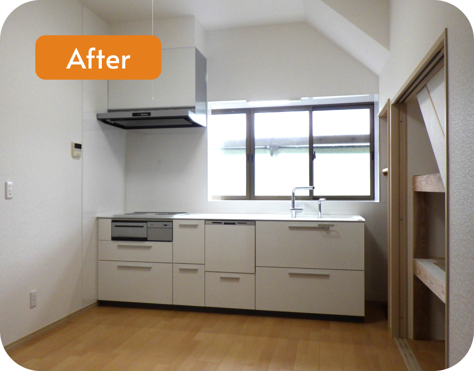 清潔感のある白で統一したキッチンは、明るく落ち着く空間になりました。内部建具も白で統一され、素敵な空間になりました。